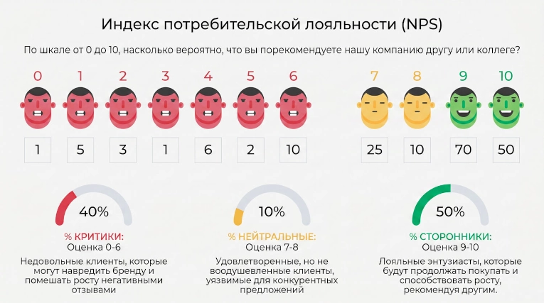 После опроса каждый участник попадает в одну из трёх групп. Те, кто поставил 9 или 10 баллов, считаются промоутерами: лояльными покупателями, готовыми рекомендовать компанию активно. Оценки 7–8 формируют группу пассивных (нейтралов): они в целом удовлетворены, но без выраженной приверженности. Наконец, все, кто оценил готовность рекомендовать в диапазоне 0–6, относятся к детракторам, или критикам.